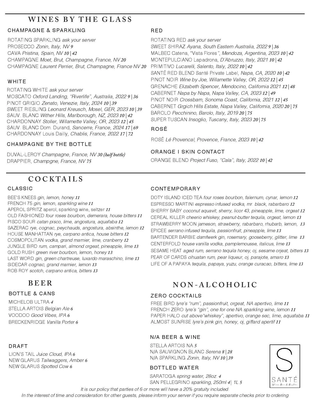Drinks MenuA curated selection of wines & cocktails for any type of night * Note *This is a sample menu. We change our wines and cocktails frequently. View fullsize View Wine List